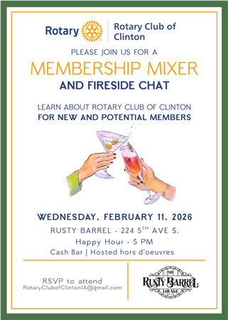 Clinton, IA — February 11, 2026 — The Rotary Club of Clinton invites community members to learn more about Rotary’s mission of service and fellowship at a Membership Mixer and Fireside Chat on Wednesday, February 11, 2026, at The Rusty Barrel Lounge, located at 224 5th Avenue South in Clinton.