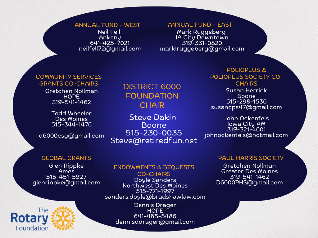 The Rotary Foundation (TRF) District 6000 endowment for the Future has been created. Endowment funds protect and invest the money donated and uses the income from those investments to fund Rotary’s good works. A special component of endowment funds is that the donated funds continue to create income in perpetuity, benefiting Rotary and District 6000 forever.